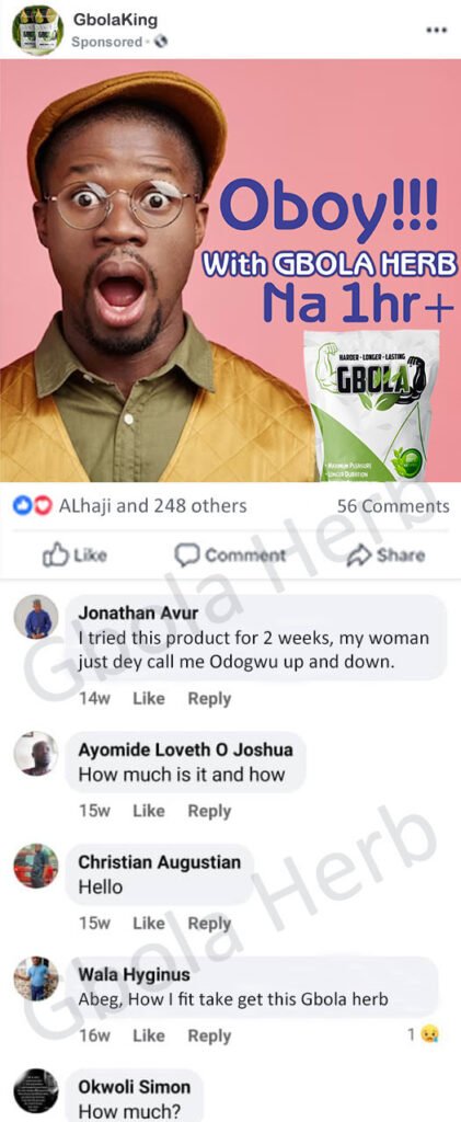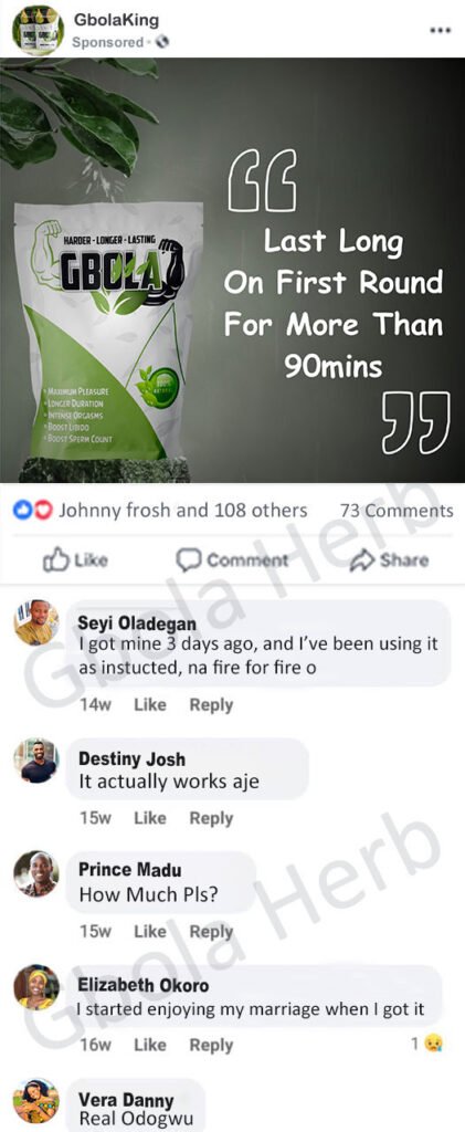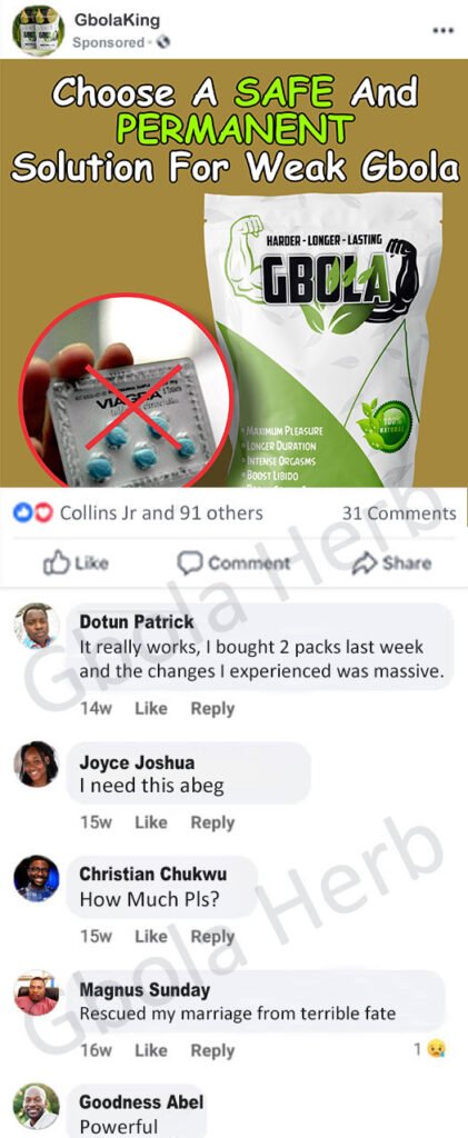 P.S. Once you start using Gbola Herb as directed by our Urologist, I’m confident you’ll never disappoint in the other room AGAIN!